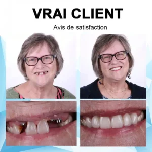 “En vieillissant et en perdant toutes mes dents, manger est devenu un véritable défi et je me sentais gênée par mon apparence. Je ne pouvais pas me permettre de consulter fréquemment le dentiste, alors j’ai décidé d’essayer ce kit de prothèses dentaires. Ce fut un énorme soulagement ! C’est abordable par rapport aux frais dentaires habituels et je peux maintenant manger sans gêne. De plus, je me sens beaucoup plus confiante avec mon sourire. Cela a changé ma vie. ” – Elizabeth J. Andes